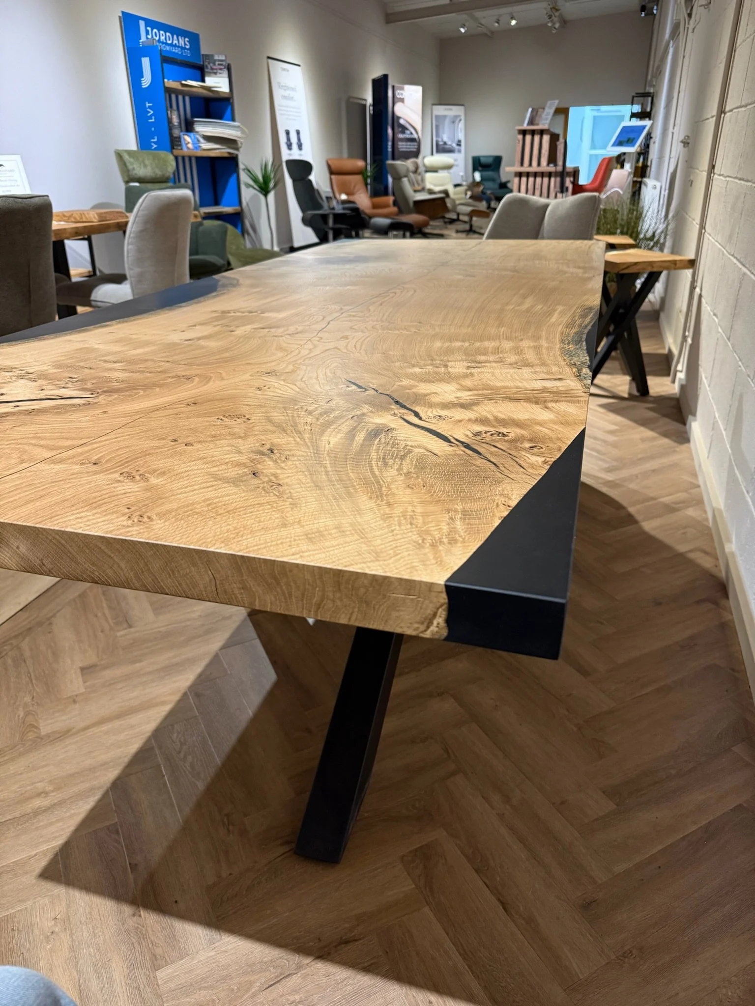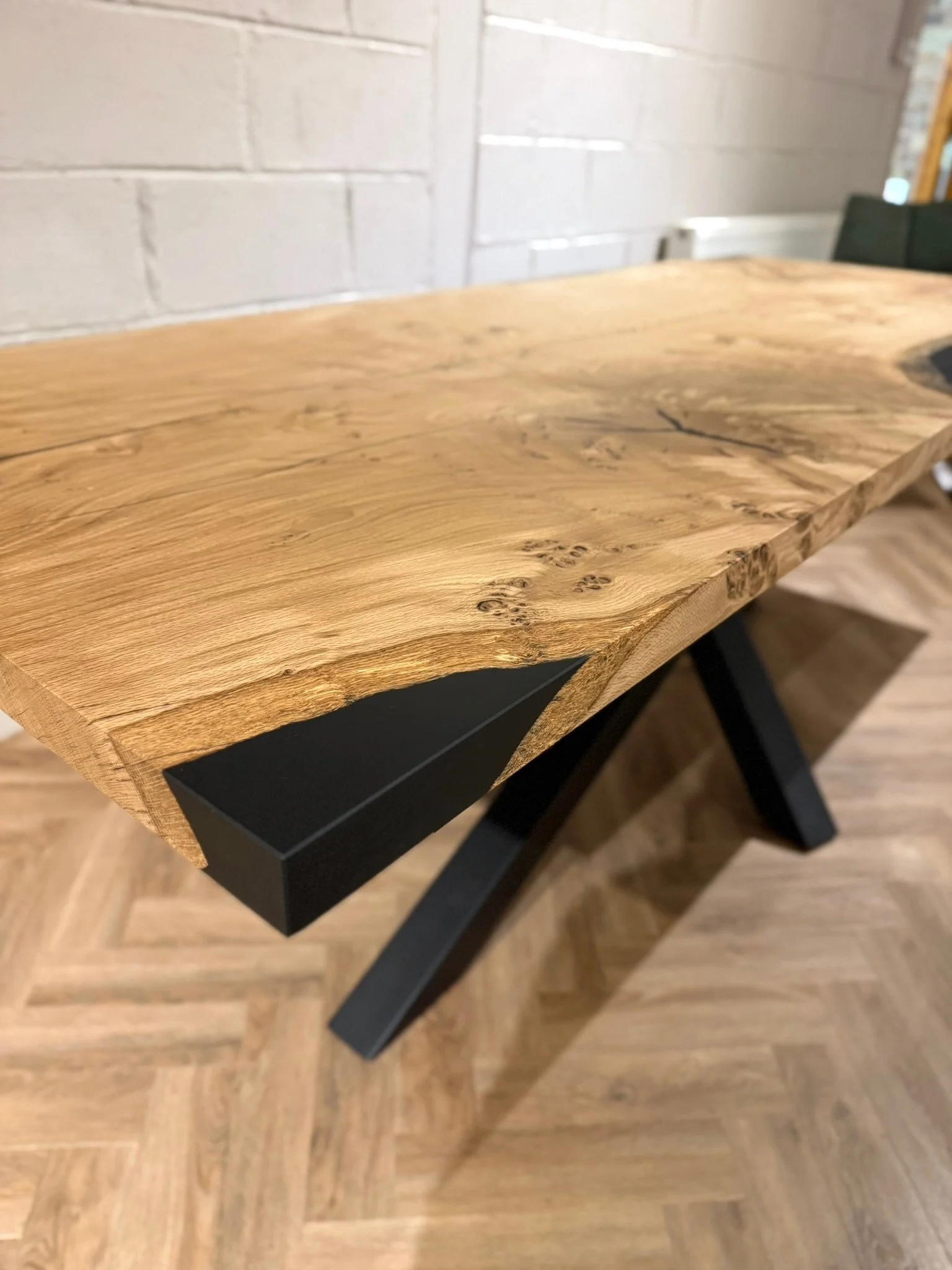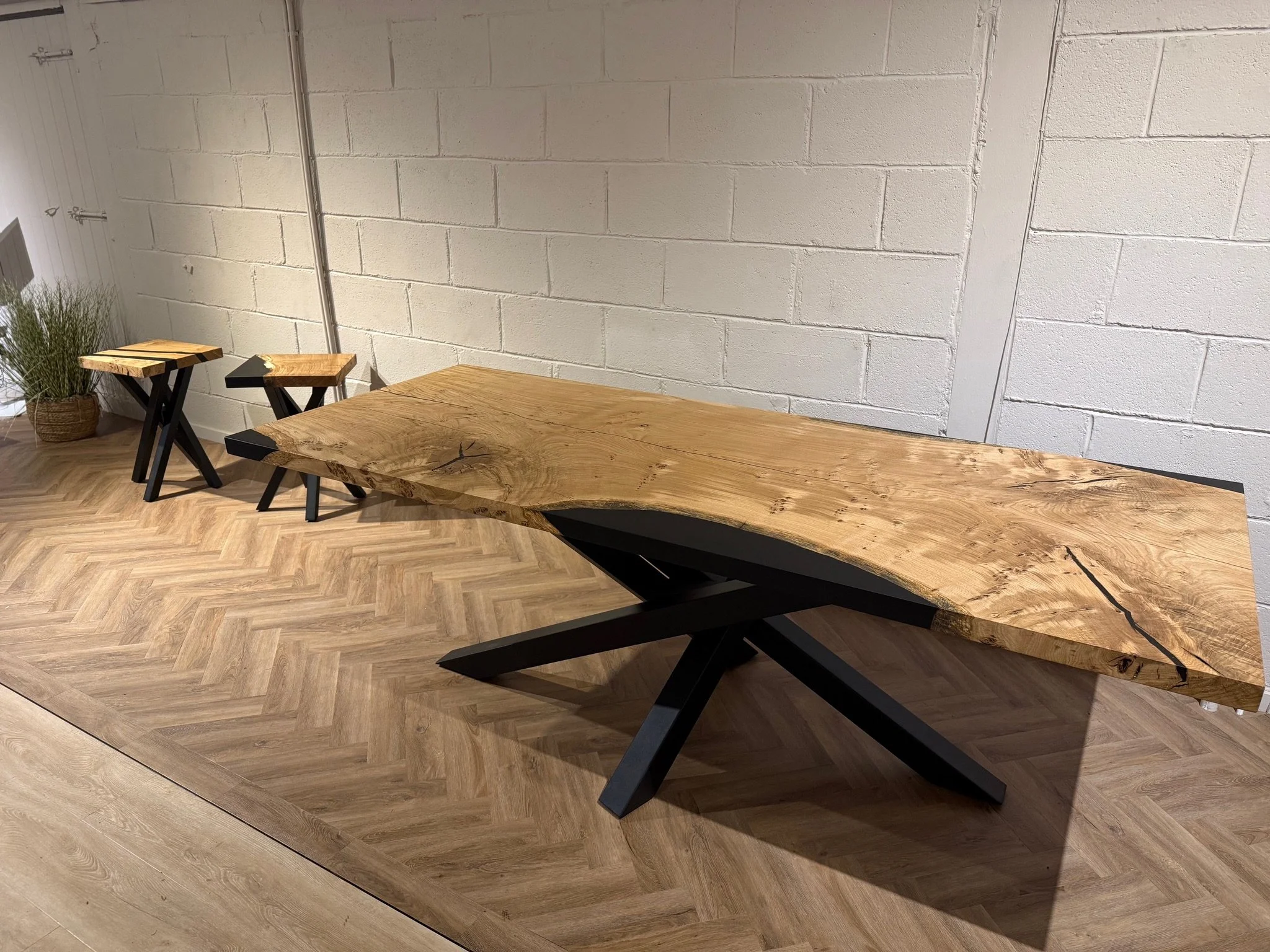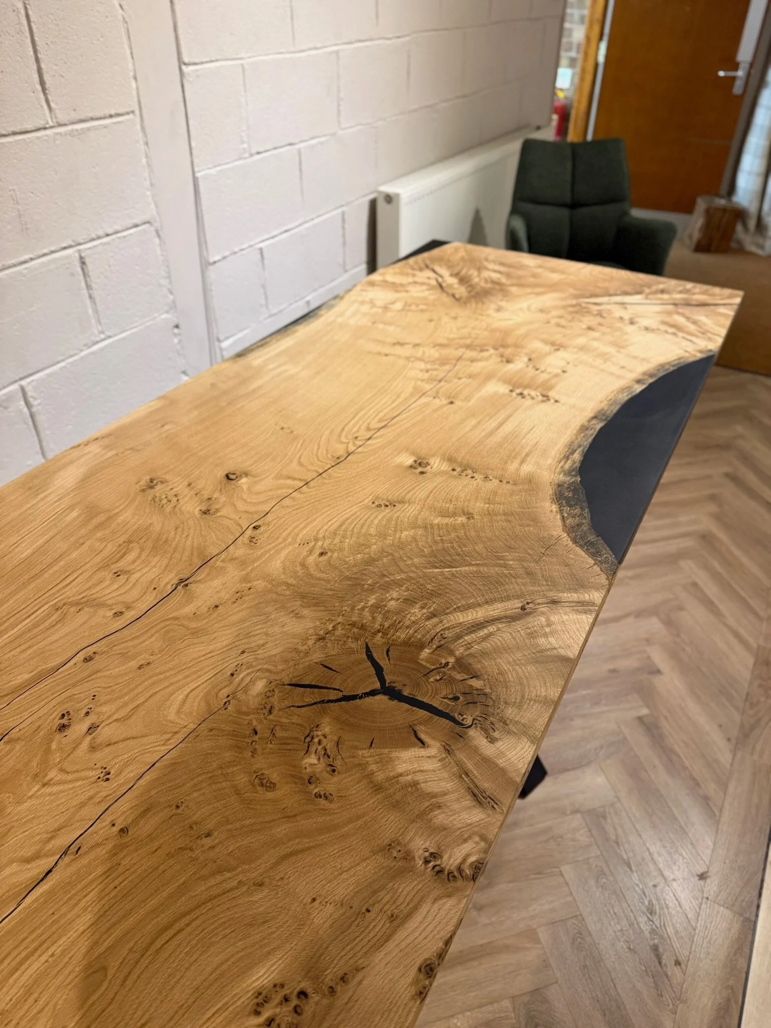 This bespoke dining table began as a single 2.2m x 0.9m slab of character oak. Its natural voids and live edge are celebrated, with a deep black resin inlay that creates a smooth, functional surface. Uniquely, the resin also forms one perfectly straight edge, offering a powerful modern contrast.