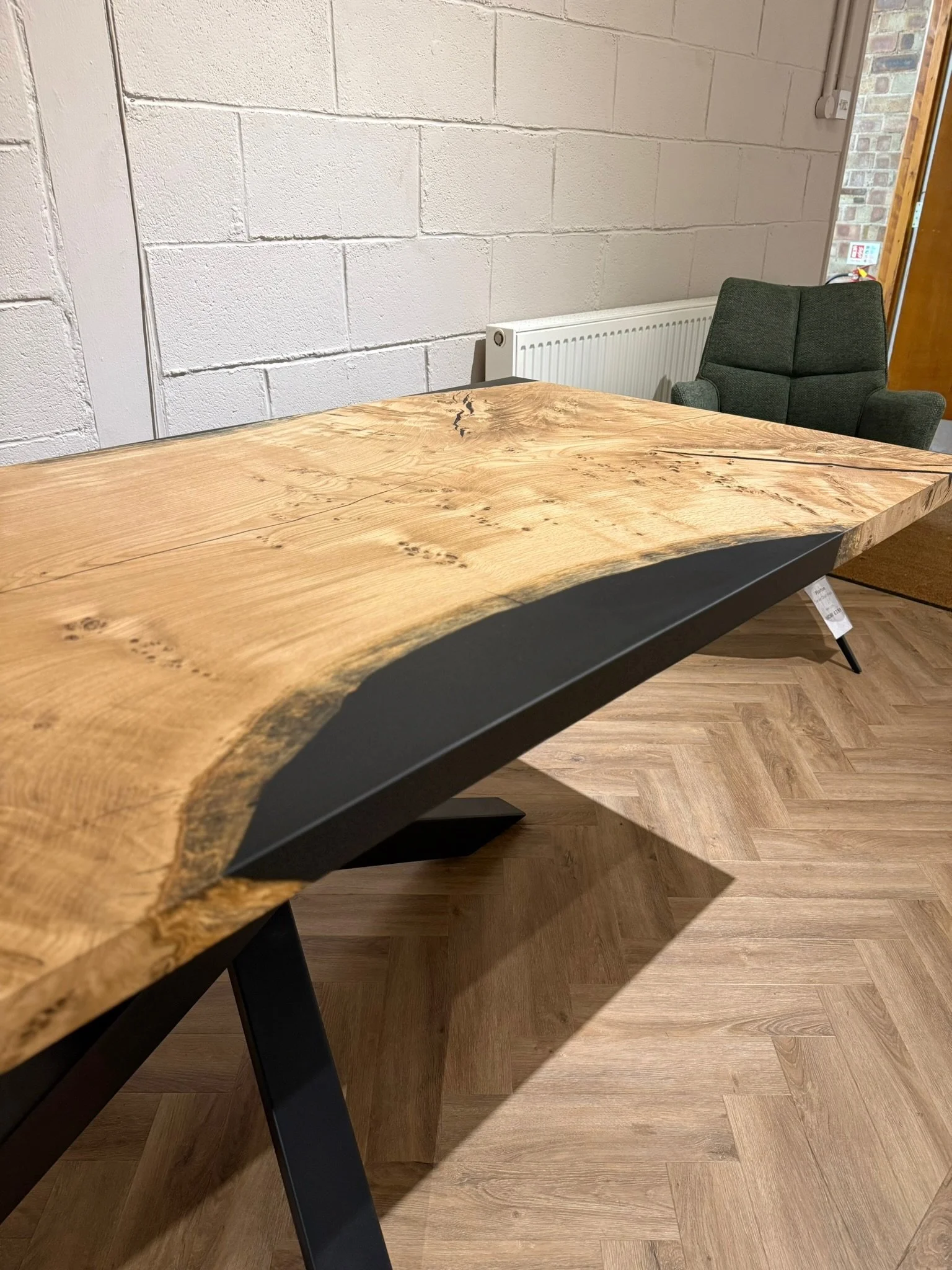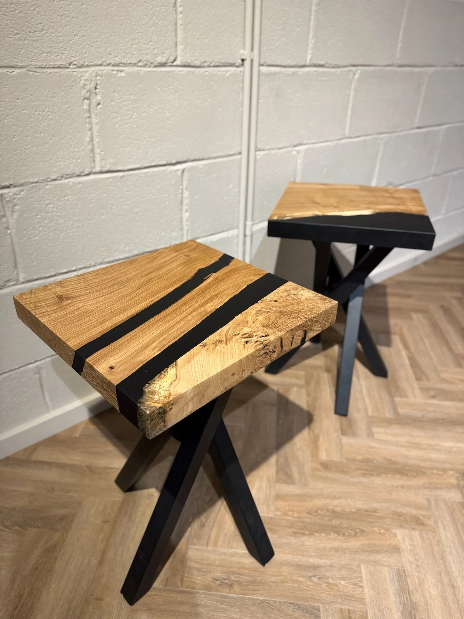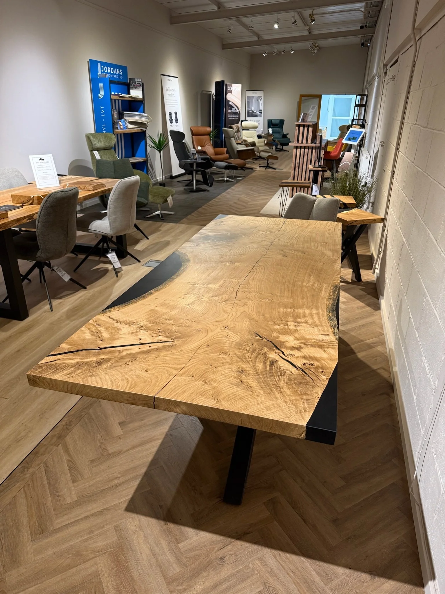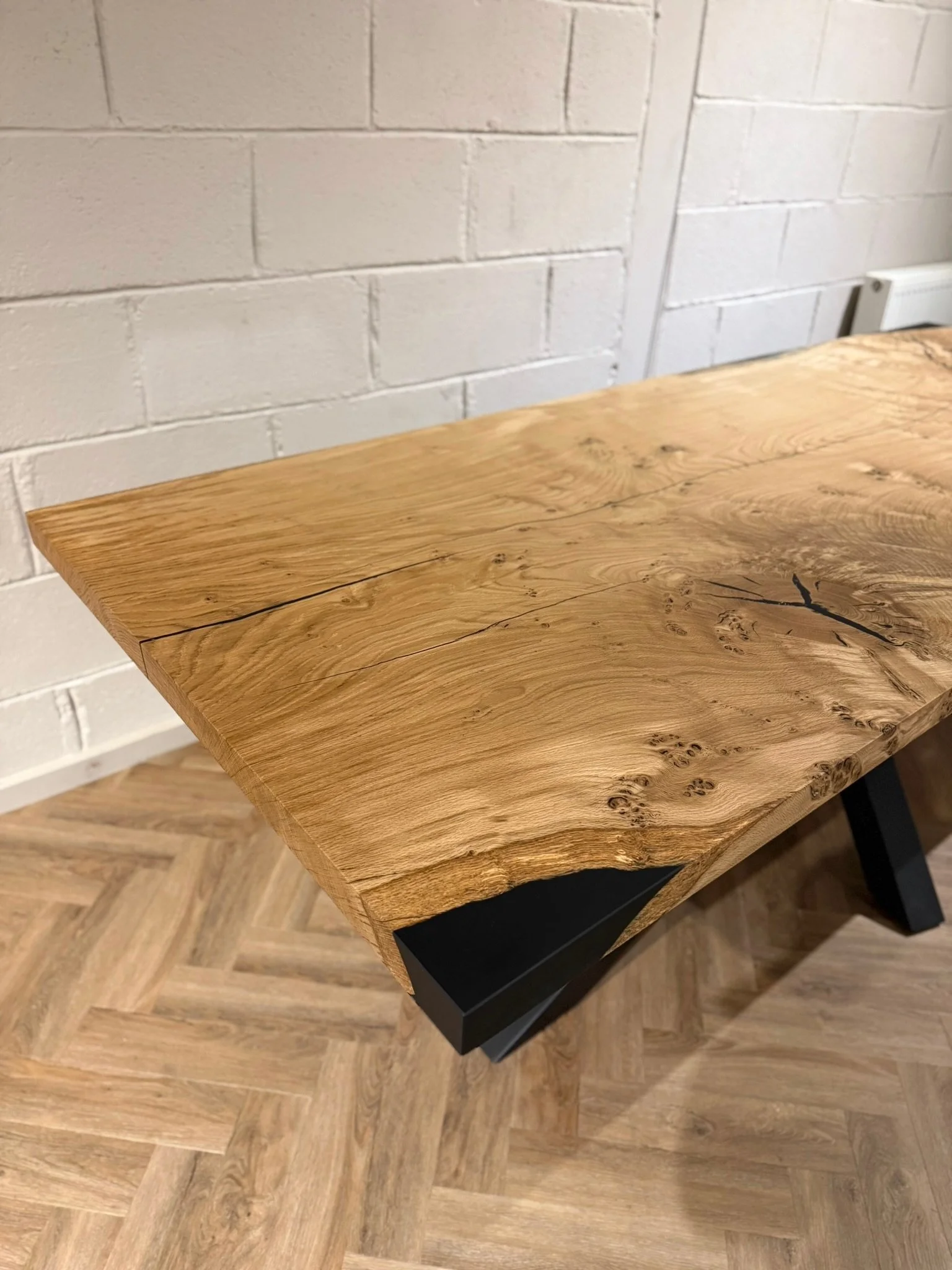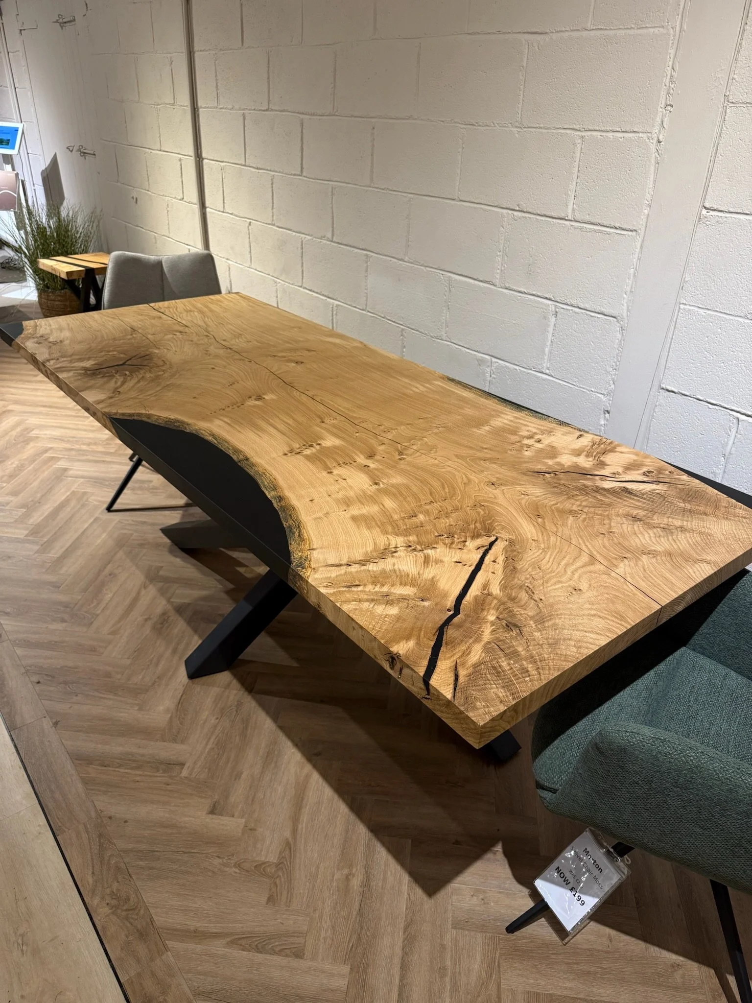 This bespoke dining table began as a single 2.2m x 0.9m slab of character oak. Its natural voids and live edge are celebrated, with a deep black resin inlay that creates a smooth, functional surface. Uniquely, the resin also forms one perfectly straight edge, offering a powerful modern contrast.