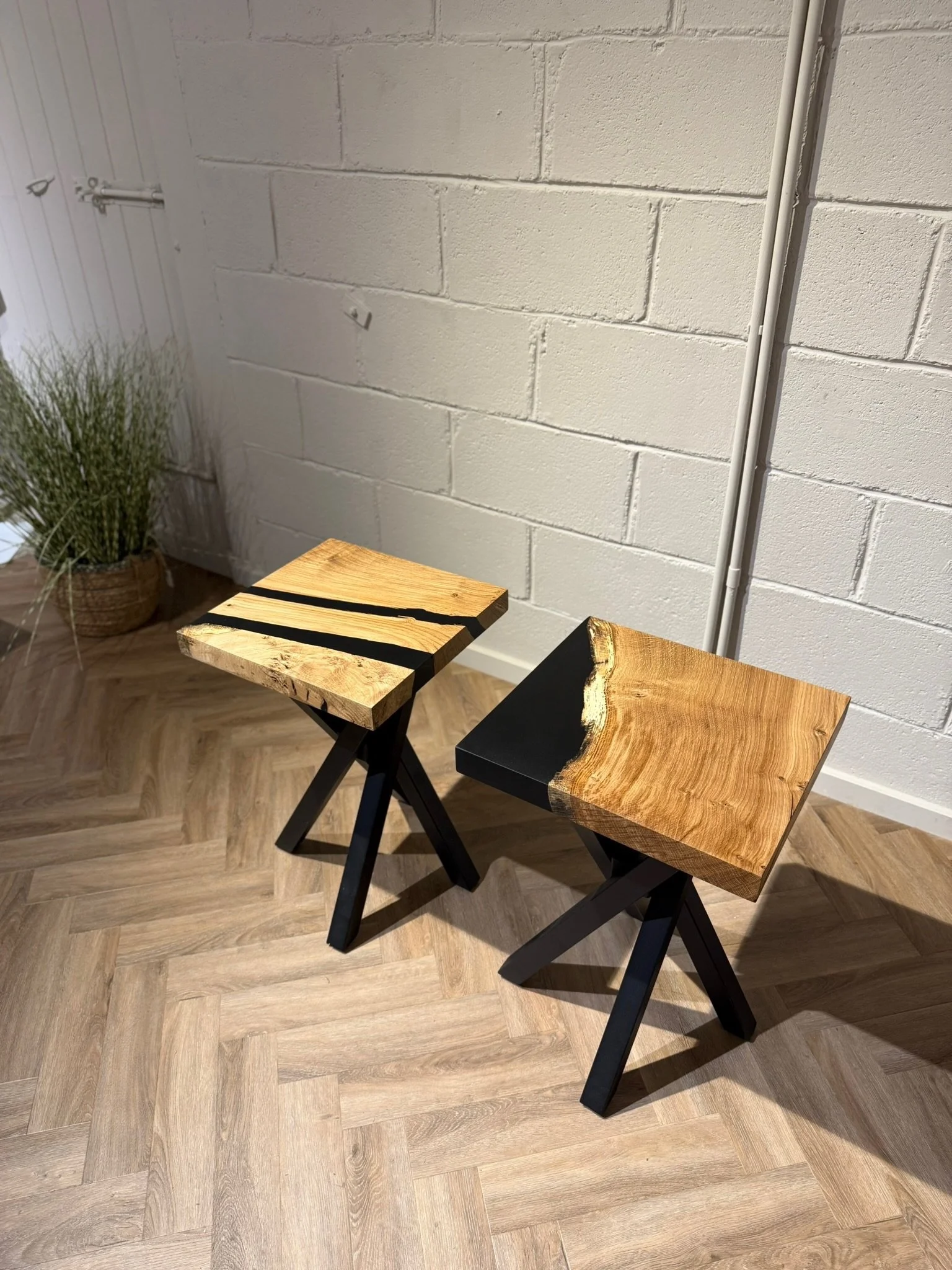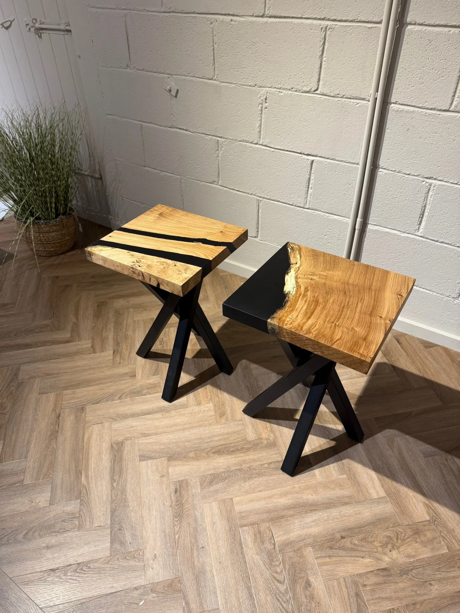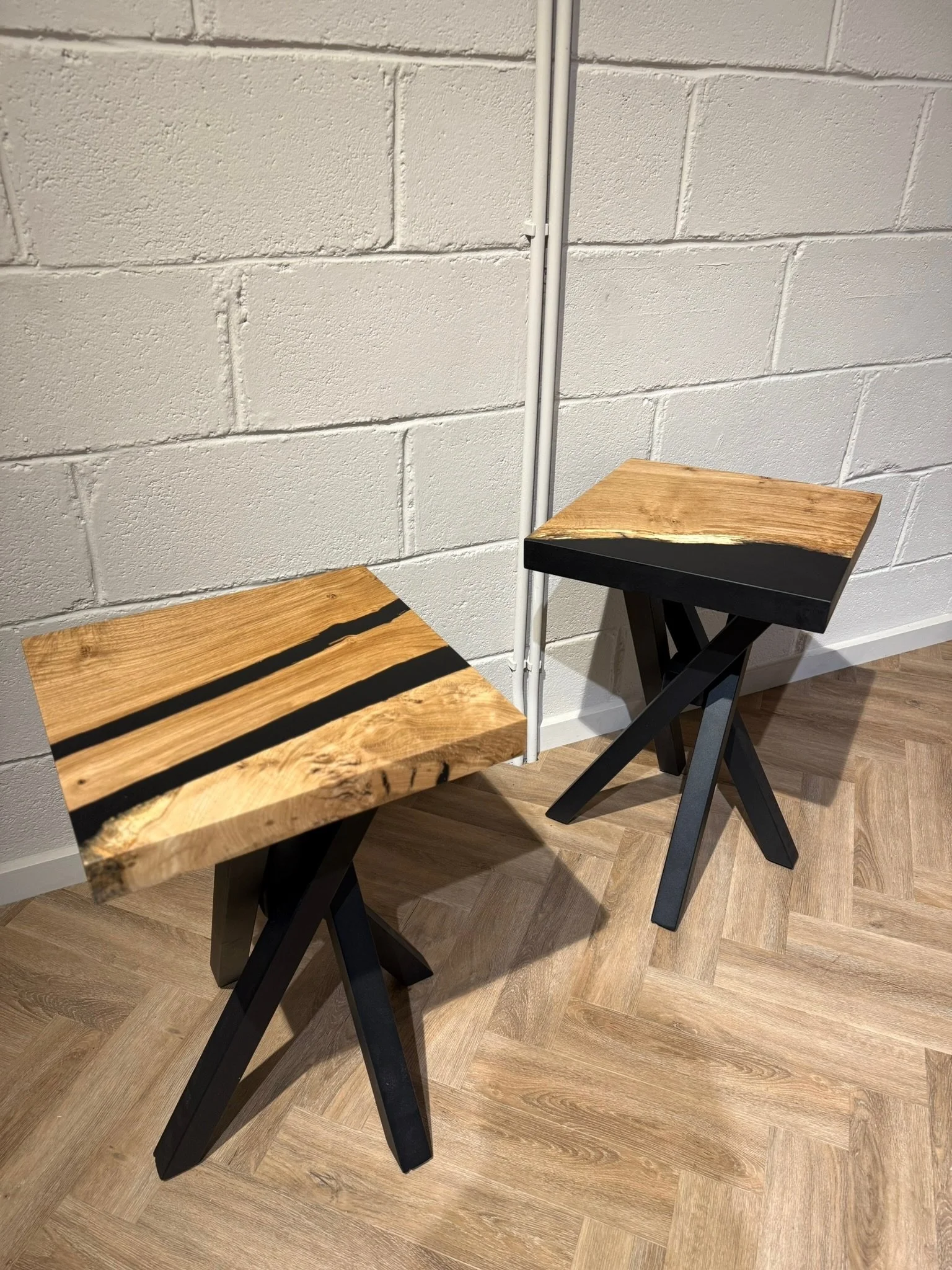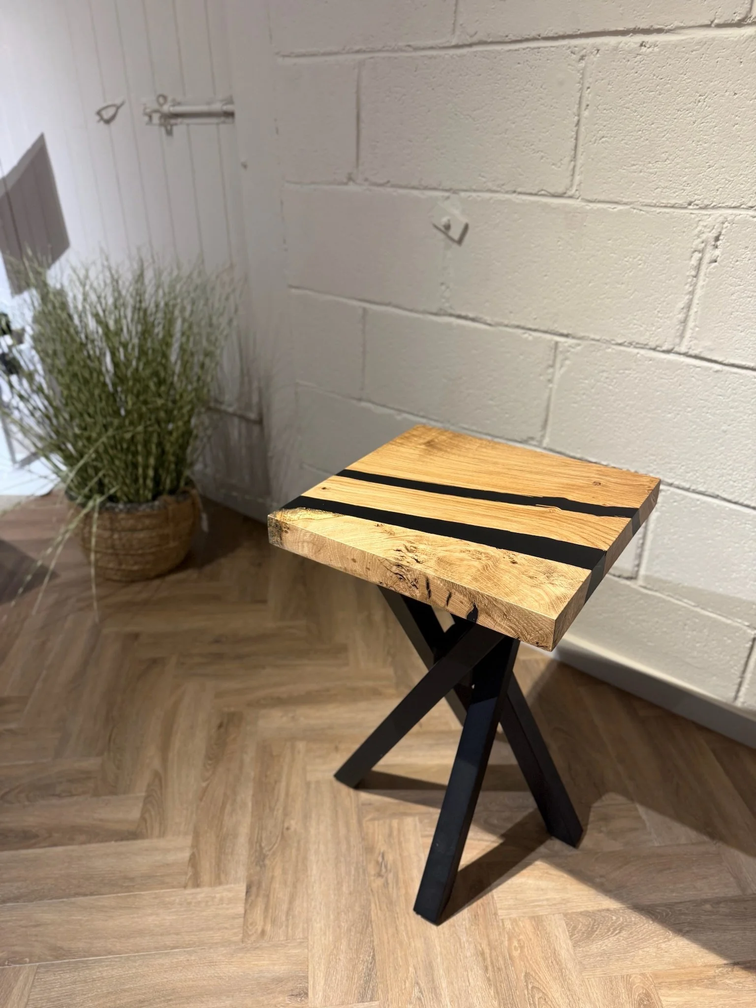 This bespoke dining table began as a single 2.2m x 0.9m slab of character oak. Its natural voids and live edge are celebrated, with a deep black resin inlay that creates a smooth, functional surface. Uniquely, the resin also forms one perfectly straight edge, offering a powerful modern contrast.